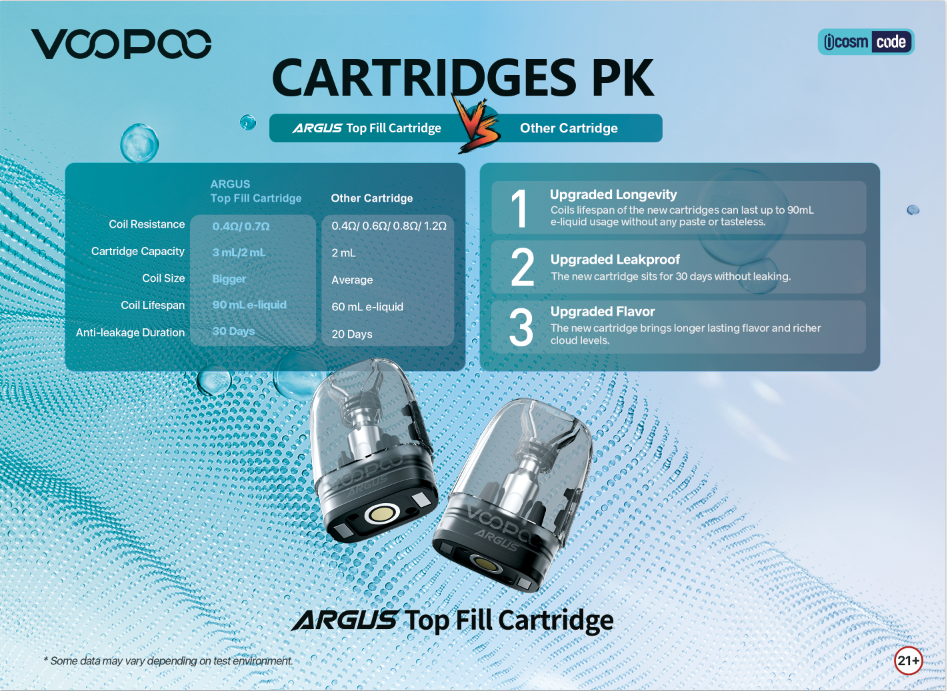 Upgraded Flavor: The newly launched VOOPOO ARGUS top fill cartridge is constructed to deliver longer-lasting flavor and richer clouds. It supports the coil resistance as low as 0.4 Ω, which is lower than most cartridges, delivering superior vape flavor. Plus, it is also available in 0.7 Ω resistance to meet the needs of users from MTL to RDL. Moreover, it is equipped with the leading iCOSM Code to ensure the taste.