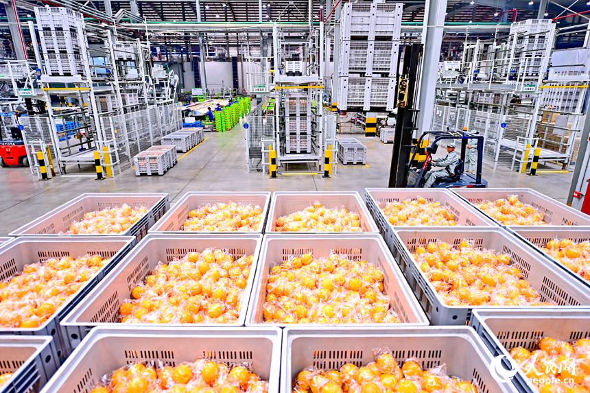 | Photo shows fresh navel oranges at the “smart” workshop of a navel orange processing company in the high-tech industrial park of Xinfeng county, Ganzhou city, east China's Jiangxi Province. (People's Daily Online/Zhu Haipeng) |