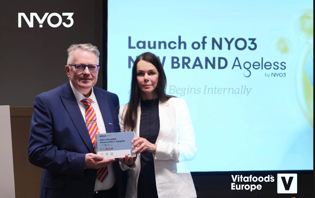 On 15th May in Geneva, Switzerland, NYO3 successfully hosted the 2024 NYO3 Global Anti-Aging Brand Launch Event at Vitafoods Europe and officially established a strategic partnership with the renowned Norwegian anti-aging research center, NO-Age. They introduced the new premium anti-aging brand, ‘Ageless’, and launched their first product, NYO3 Ageless MAXI-COLLAGEN Advanced Micro-Tripeptide, marking a new era in anti-aging solutions.