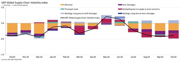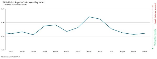 CLARK,N.J.,Nov. 12,2024 -- The GEP Global Supply Chain Volatility Index— a leading indicator tracking demand conditions,shortages,transportation costs,inventories and backlogs based on a monthly survey of 27,000 businesses — posted -0.39,which was little change from -0.43 in September. Therefore,the index remained in territory that indicated one of the highest levels of spare capacity at global suppliers in over a year during October,with no imminent turnaround in Western manufacturing in sight.