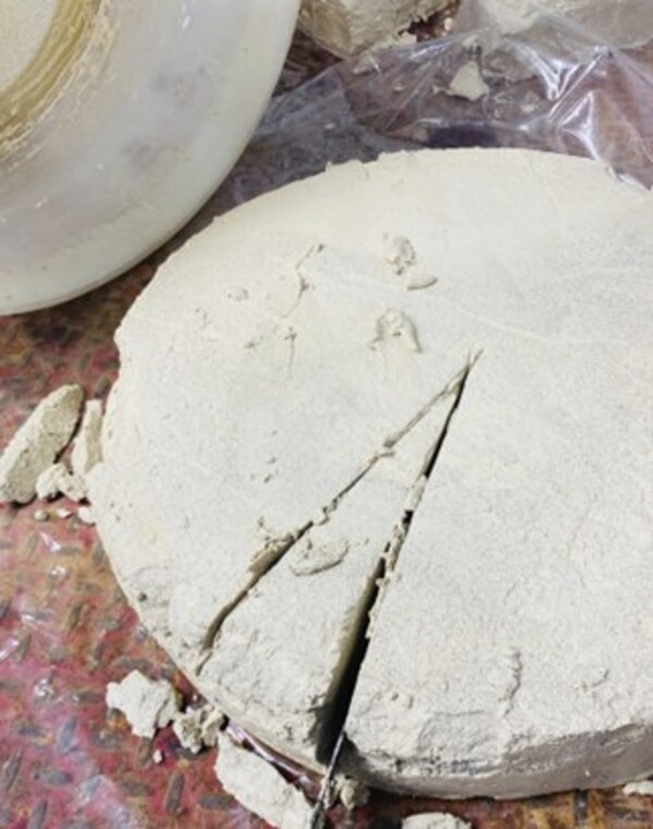 Figure 4: Filtering stage and resultant filter cake post water-leaching and impurity removal. (CNW Group/Patriot Battery Metals Inc.)