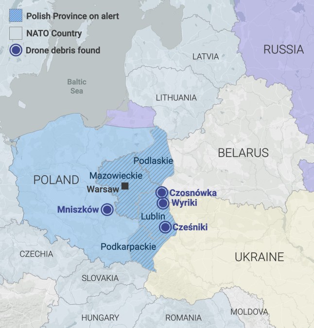 A map showing where drone debris were discovered in Poland last week (Picture: Metro)After that meeting on Sunday evening,a ministry statement said Romania had ‘conveyed its strong protest against this unacceptable and irresponsible act,which constitutes a violation of (its) sovereignty.’It added: ‘Such recurring incidents contribute to the escalation and amplification of threats to regional security.’