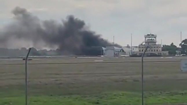 An eyewitness said the scene turned black with smoke after the plane smashed into the hangar building (Picture: X)